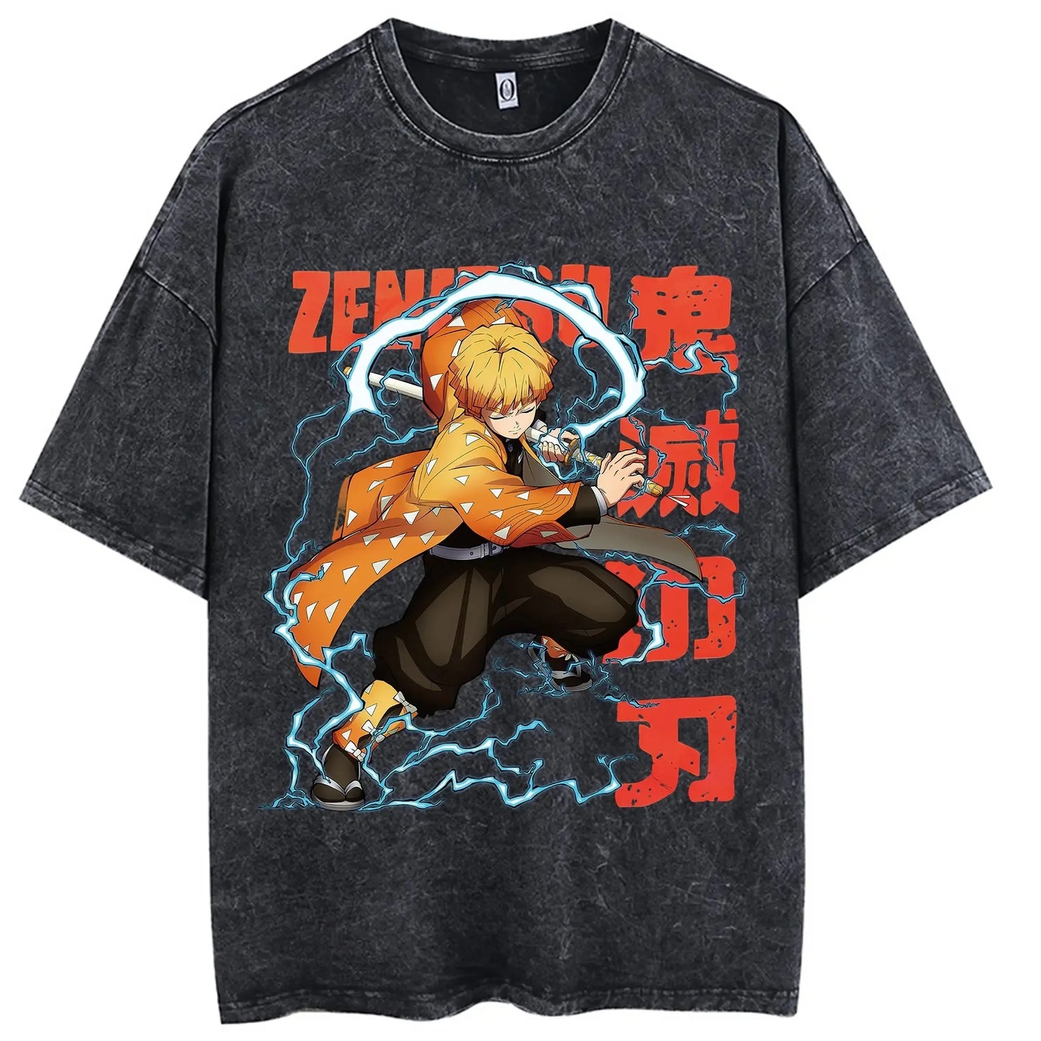Anime Demon Slayer Agatsuma Zenitsu Graphic T Shirt Men Manga Vintage Tshirts Washed Cotton T-shirt Harajuku Male T-Shirt