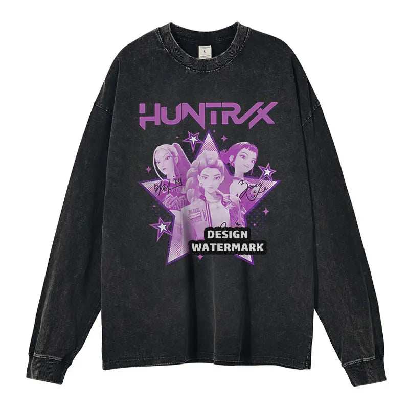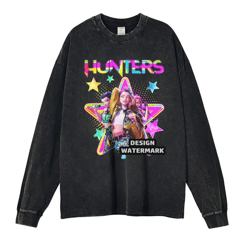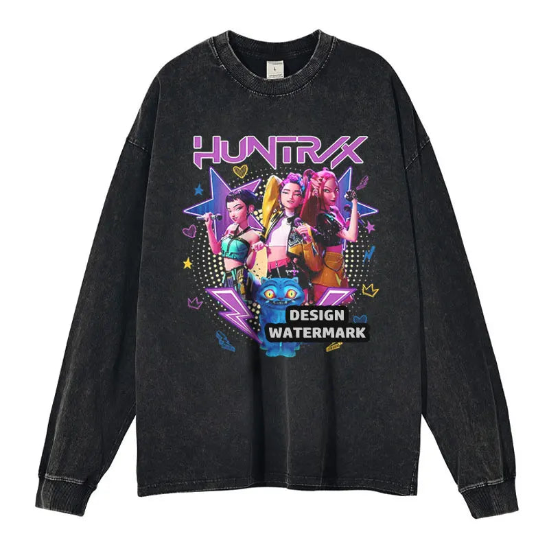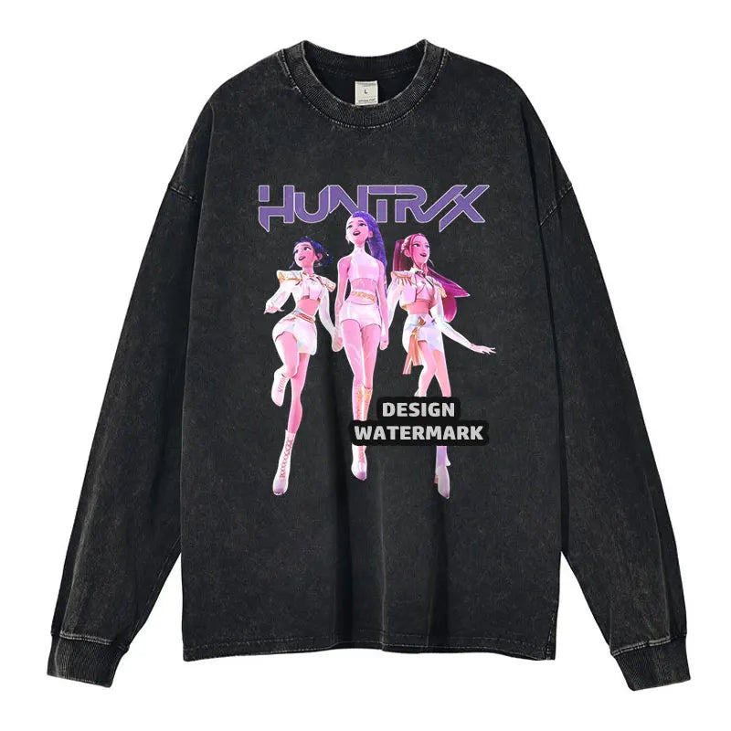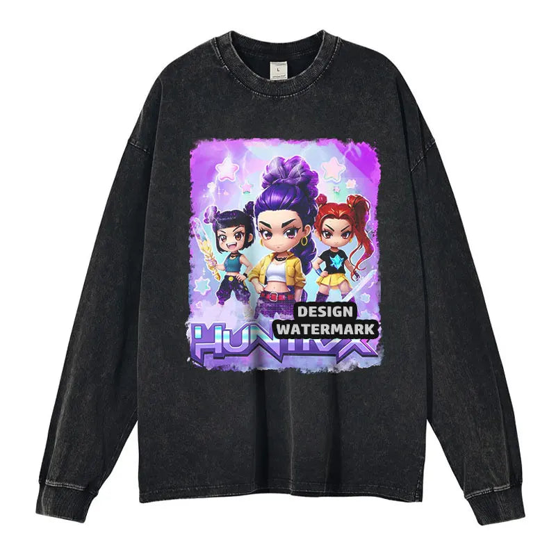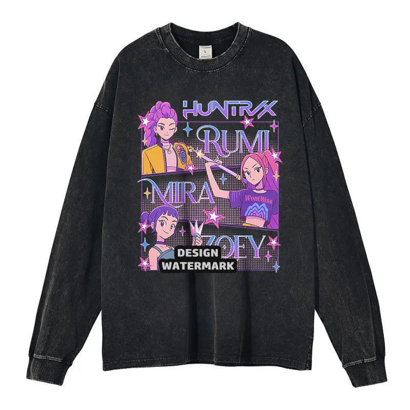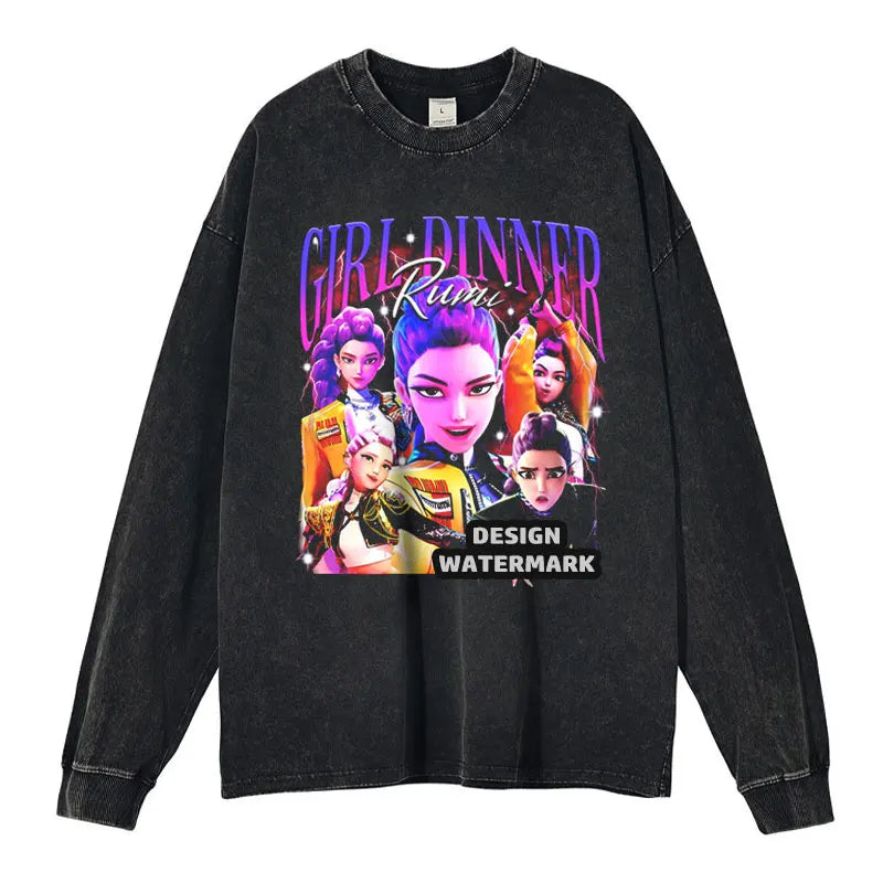 Anime Rumi Sweater Vintage Washed K-KPop D-Demon Hunters Long Sleeve T Shirts Oversized Mira Sweatshirts Tops Tees 100% Cotton