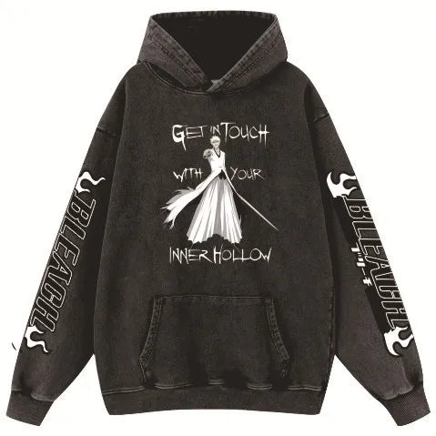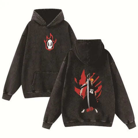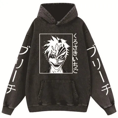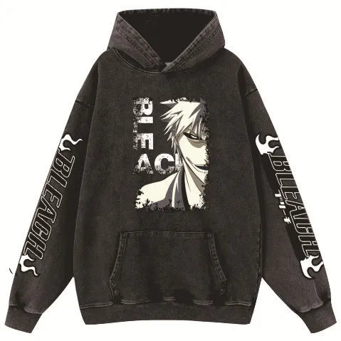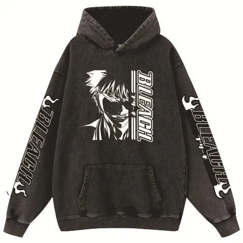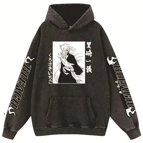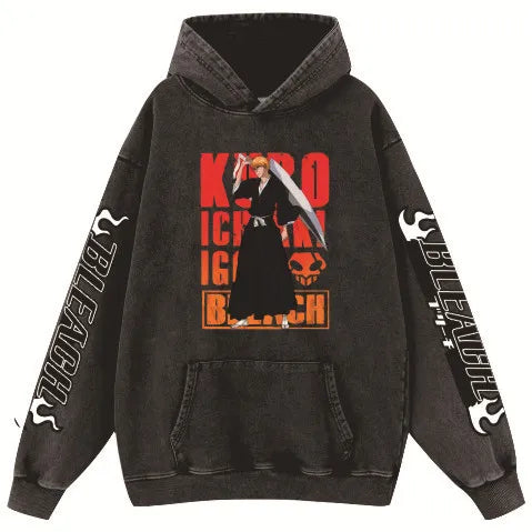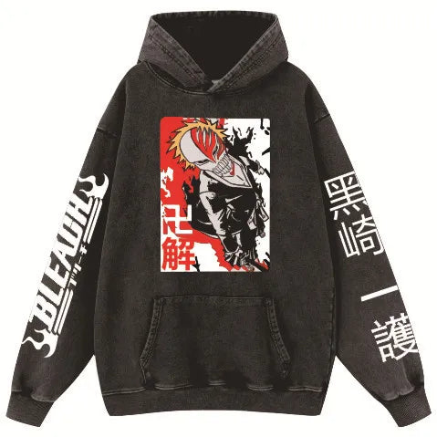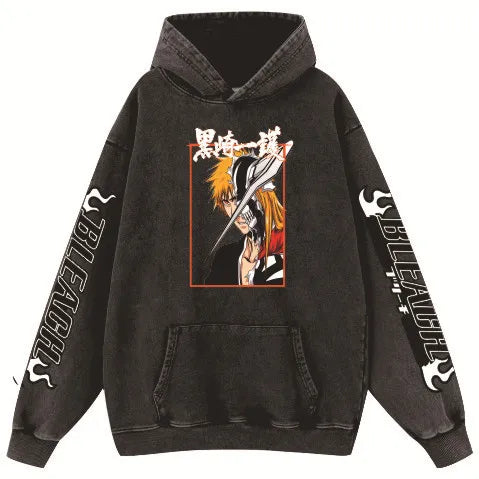 Hot Anime BLEACH Kurosaki Ichigo Graphic Washed Hooded Men Women Cotton Hoodies Vintage Casual Streetwear Harajuku Sweatshirt